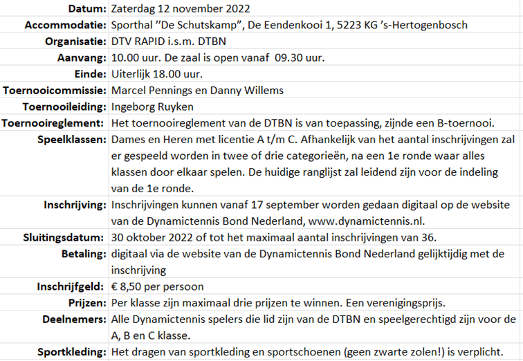 Hierbij nodigen wij u mede namens de Dynamictennis Bond Nederland uit voor de 17e Masters Dynamictennis enkelspel op zaterdag 12 november 2022 in sporthal de Schutskamp te ‘s-Hertogenbosch.